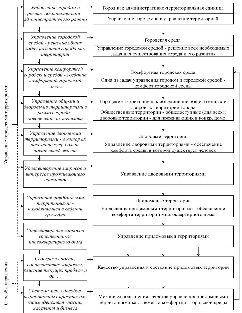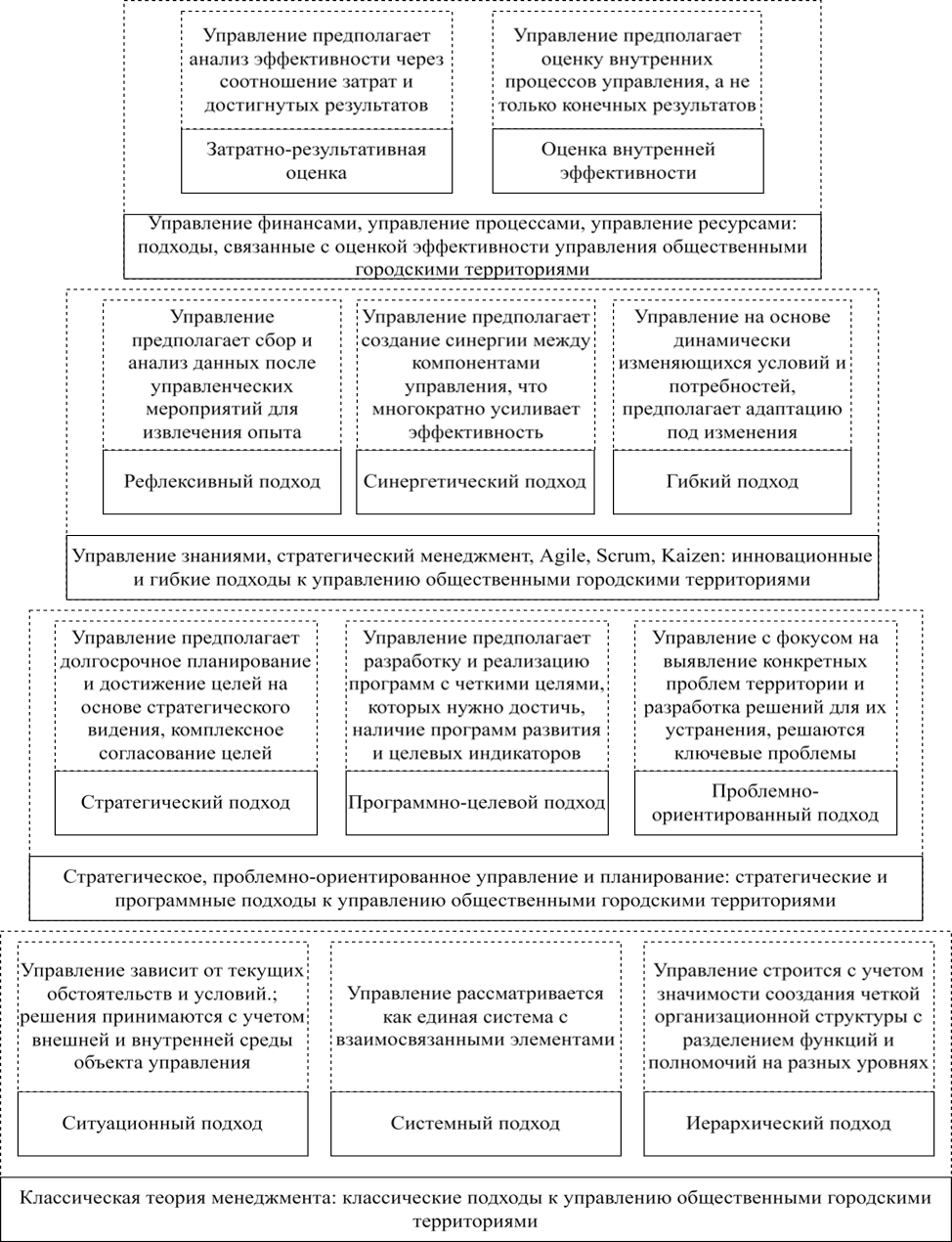 Открытым также остается вопрос выработки подхода к оценке качества управления дворовыми и придомовыми территориями, базисом разработки которого представляется систематизация и согласование описанных ранее подходов с фундаментальными идеями менеджмента – управления общественными городскими территориями. Таким образом, систематизация подходов к управлению общественными городскими территориями приобретает следующий вид (см. рис. 2).