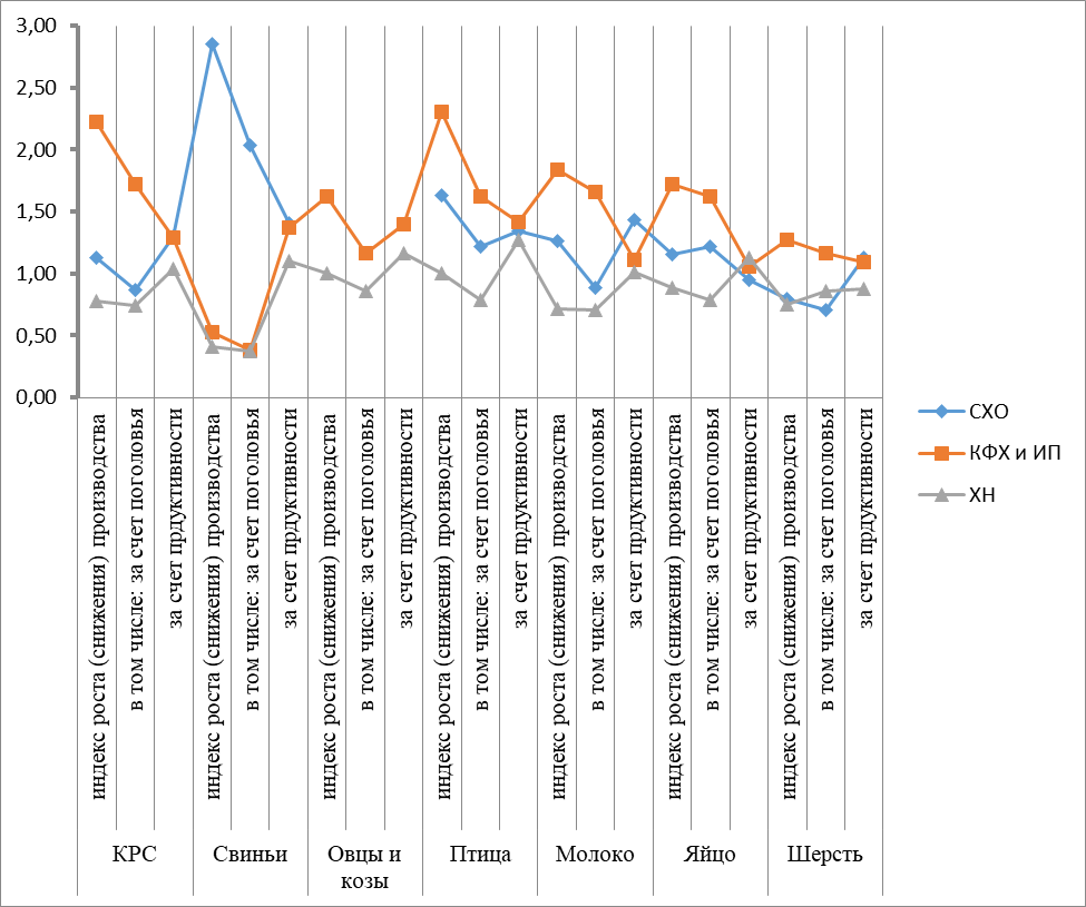Результаты и обсуждение. Складывающиеся тенденции в изменении значений показателей вклада сельскохозяйственных предприятий, крестьянских (фермерских) хозяйств и личных подсобных хозяйств в формирование общероссийских объемов производства продукции растениеводства и животноводства, рассчитанные по средним за трехлетия данным, иллюстрируются материалами, представленными в таблице 1.