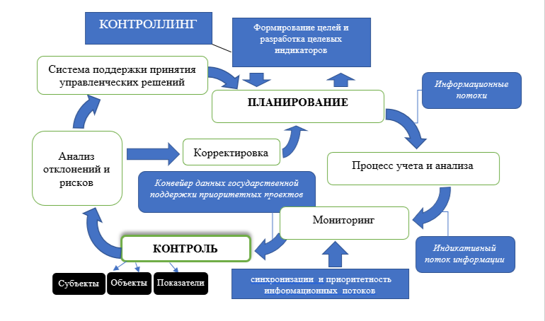 Рис. 1. Модель компонентов контроллинга в движении информационных потоков государственной поддержки приоритетных проектов (разработана авторами на основании [3,6])