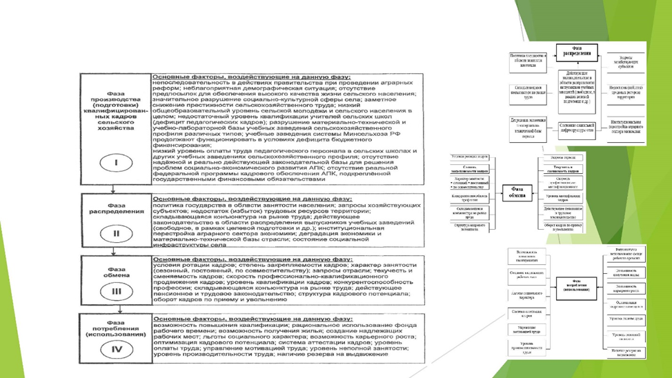 В теоретико-методологическом плане пофазно рассмотрен полный цикл воспроизводства квалифицированных кадров АПК – от фазы подготовки кадров (школа, колледж, вуз) с его особенностями до распределения выпускников (свободного или по целевому приему), к фазе обмена (включая ротацию, скорость квалификационного продвижения, характер занятости и другие аспекты), до следующей фазы – использования в сельскохозяйственных организациях региона (рисунок 1).