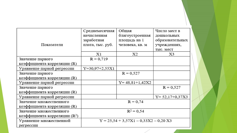 С учетом наиболее значимых факторов была построена линейная регрессионная модель. Уравнения парной регрессии позволили установить значения приростов уровня закрепляемости при изменении того или иного наиболее значимого фактора. Так, следует заметить, что в случае увеличения числа мест в дошкольных учреждениях региона в среднем на 1 тысячу мест, уровень закрепляемости молодых специалистов возрастает на 0,37%. Что касается решения проблемы благоустройства сельского жилья, то здесь результаты следующие – закрепляемость молодых специалистов увеличивается на 1,42% при росте показателя в среднем на 1 квадратный метр на 1 человека, проживающего в сельских территориях. При росте средней заработной платы на 1 тысячу рублей показатель уровня закрепляемости возрастает на 2,5% [3].