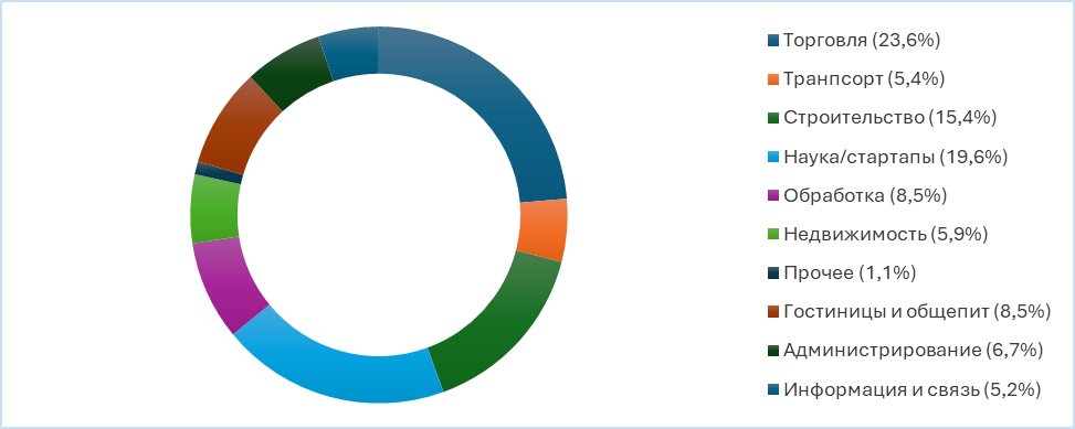 Численность занятых в отраслях тоже где-то порядка 20% населения, а в зарубежных странах количество людей занятых в бизнесе подавляющее большинство. И если посмотреть распределение по отраслям, она где-то одинаковая, потому что везде это сфера услуг или торговля, в котором наибольший вес занимает малый и средний бизнес. То, чего у нас совсем почти нет, деятельность в профессиональной и научной сфере. Если посмотреть и сравнить, она занимает в зарубежных странах среди малых предприятий почти 20%. Это говорит о том, что те самые стартапы начинают развиваться и государство их активно финансирует.