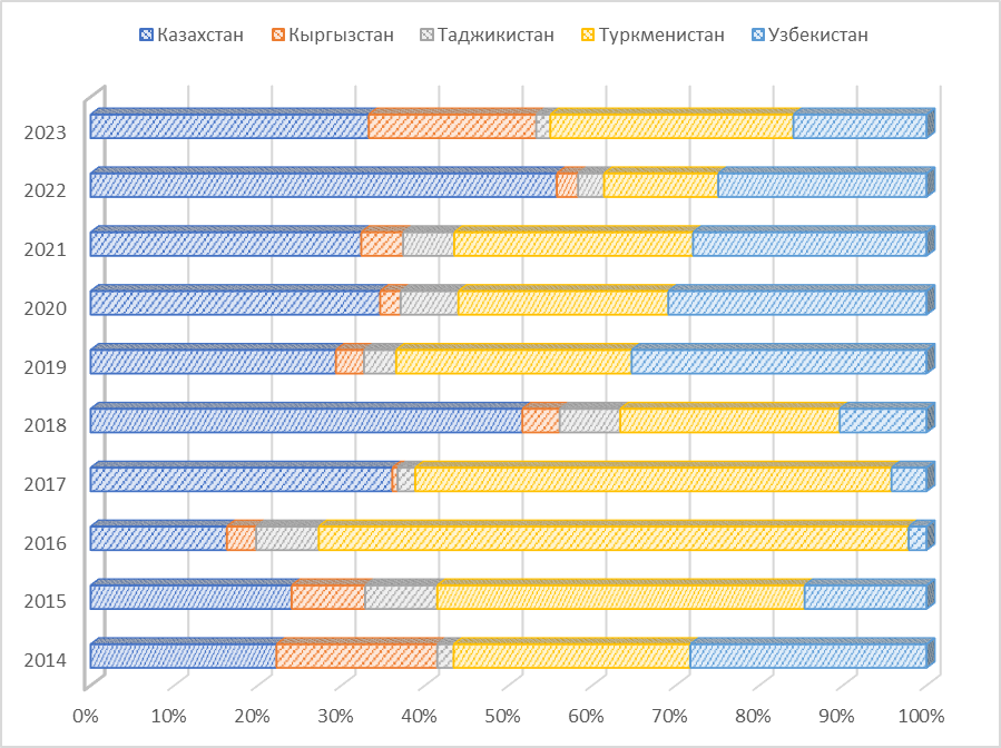 КНР осуществляет международное сотрудничество с Узбекистаном, Туркменистаном, Таджикистаном, Кыргызстаном, Казахстаном в границах собственной инициативы «Пояс и путь». То есть, эта страна является исключением. Между странами Центральной Азии более интенсивными темпами стали осуществляться различные интеграционные процессы. Так, согласно имеющейся информации, в периоде с 2018 по 2023 годы странами Центральной Азии было организовано 5 встреч, проводимых на высшем уровне (другими словами, саммитов). Главная цель данных политических мероприятий, участниками которых были высшие руководители, состояло в усилении регионального сотрудничества стран Центральной Азии. Следует подчеркнуть, что для нашего государства страны Центральной Азии уже длительное время являются деловыми партнерами в рамках внешнеэкономической деятельности, чем и обуславливается актуальность перспектив взаимодействия стран Центральной Азии с РФ. В этом регионе между странами происходит весьма ожесточенная конкурентная борьба. Таким образом, наша страна, в связи с этим должна применять гибкие форматы сотрудничества с государствами Центральной Азии, которые в максимальной степени принимают во внимание особенности этих государств, соответствующие условия взаимодействия с ними. То есть, Российской Федерацией должна реализовываться стратегия, которая будет базироваться на накопительной интеграции. В данном случае будет необходимо сосредоточить усилия на стимулировании инициатив на разных уровнях, проведении совместных с государствами ЦА проектов [23].