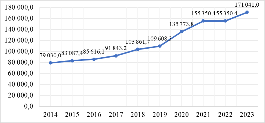 Динамика общего объема экспорта стран Центральной Азии и России с 2014 по 2023 годы демонстрирует существенное расхождение в темпах роста между регионами. В Центральной Азии объем экспорта возрастал неравномерно, начиная с 134 170,9 тыс. долларов США в 2014 году и достигнув 296 076,4 тыс. долларов США в 2023 году. В то же время Россия показала значительно более высокие объемы экспорта, которые увеличились с 640 271,3 тыс. долларов США в 2014 году до 1 196 411,3 тыс. долларов США в 2023 году.