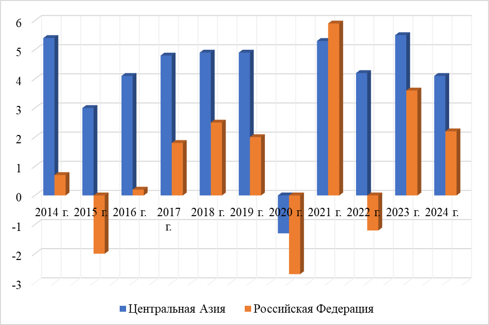 Динамика экономического роста в России и странах Центральной Азии в последние годы демонстрирует разнонаправленные тенденции, связанные с последствиями глобальных кризисов, внутренними экономическими реформами и внешними вызовами. После спада в 2020 году, обусловленного пандемией COVID-19, обе экономики показали восстановление в 2021 году: прирост реального ВВП в Центральной Азии составил 5,3%, а в России — 5,9%. Однако в 2022 году Россия столкнулась с экономическим спадом (-1,2%) на фоне геополитической напряженности и международных санкций, в то время как Центральная Азия продолжила умеренный рост на уровне 4,2%, поддерживаемый экспортом сырья и внутренним потреблением.