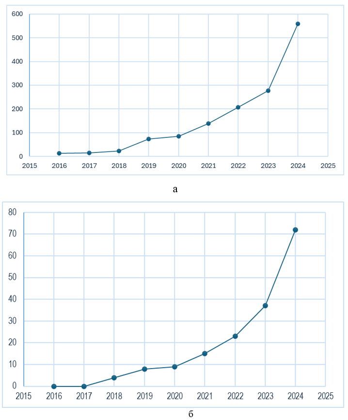 Рис. 2. Динамика роста публикаций, отобранных в Scopus за период с 2014-2024 гг.,
