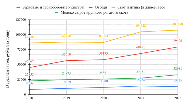 На рис. 4 отражена динамика стоимости основных сельскохозяйственных товаров. Средние цены на зерновые и зернобобовые культуры значительно выросли в период с 2018 по 2021 гг., увеличившись почти вдвое. Такое повышение было обусловлено увеличением себестоимости производства, невозможностью прямого приобретения качественных семян и удобрений из-за рубежа, а также ограничениями экспорта продукции. Повышение тарифов на топливо, увеличение расходов на хранение и транспортировку продукции ввиду необходимости переориентации рынков сбыта, существенно повлияли на цену овощей: за рассматриваемый период она демонстрировала устойчивую тенденцию к росту, достигнув пика в 2022 г.