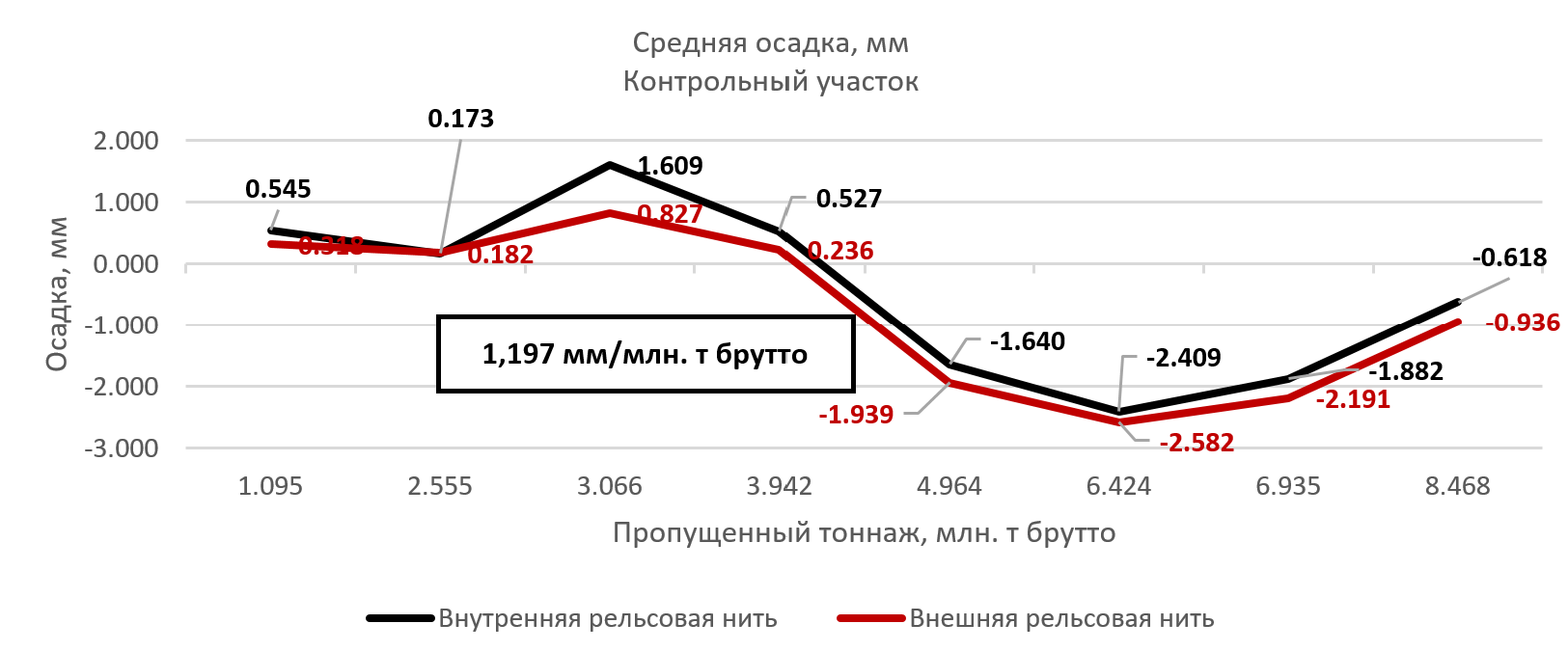 - на контрольном участке – 1,197 мм / млн. тонн брутто пропущенного тоннажа.