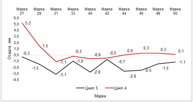 В период с января по май 2025 года проведено 9 циклов геодезического контроля деформаций основной площадки земляного полотна, первый из которых является нулевым (Таблица 1).