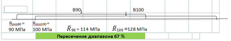 Вторая составляющая, которая не позволяет однозначно идентифицировать показатели качества бетонов, например, сравнивая бетон B90 и 100 при отличающихся показателях минимальной Rmin и средней прочности $$\bar{R}$$, это то, что диапазон возможных значений прочности для каждого класса пересекается на 67 % (Рис. 2) [4].