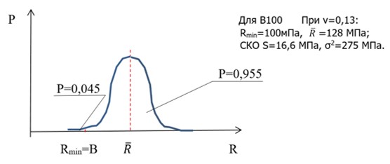 Рис. 3. Нормальный закон распределения прочности бетона В100