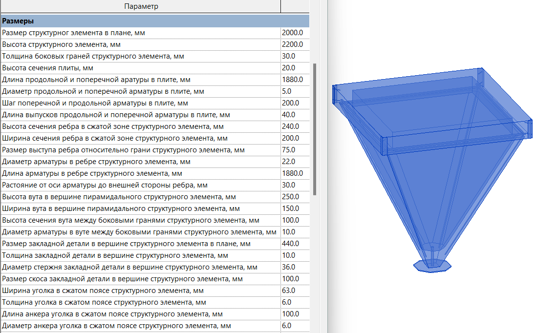 Для получения технико-экономических показателей средствами программы Revit сформирована информационная модель структурного элемента. Для упрощения работы и внесения корректировок в размеры элементов и свойства материалов модели присвоены параметры, при изменении которых происходит изменение геометрии с последующим перерасчетом технико-экономических показателей. Параметры информационной модели приведены на Рис. 4.