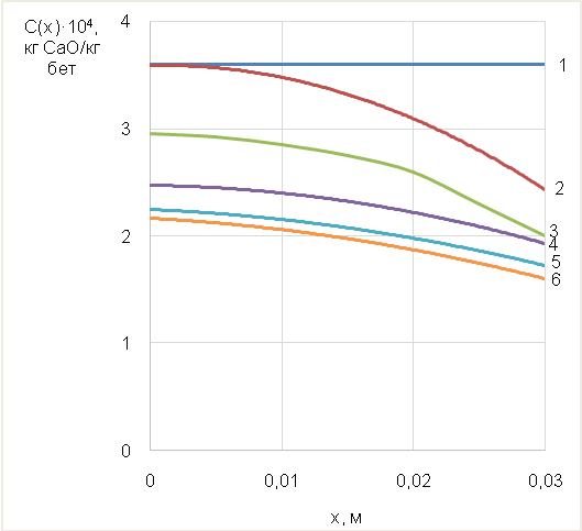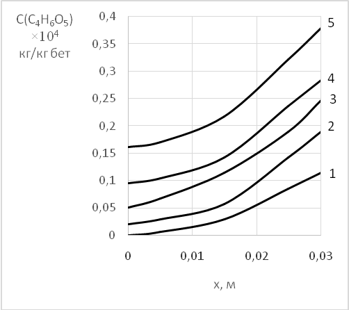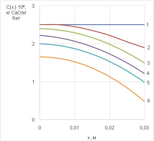 Профили концентраций дают возможность провести оценку плотности потока переносимых компонентов по толщине цементного камня бетона и позволяют рассчитать периоды начала необратимых коррозионных разрушений в железобетонном изделии. Значение суммарной концентрации органических кислот равное 0,05 г/л у поверхности стальной арматуры достигается через 1430-1446 дней (≈ 4 года) после заражения поверхности цементного камня микромицетами Aspergillus niger.
