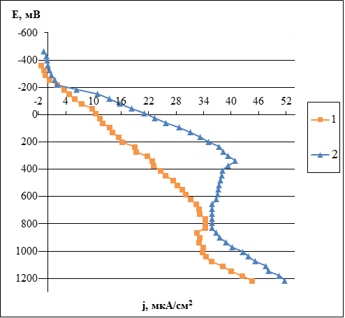 Рис. 2. Поляризационные кривые арматуры из стали класса проката А500С в цементном камне, находящемся в условиях воздействия влаги:
