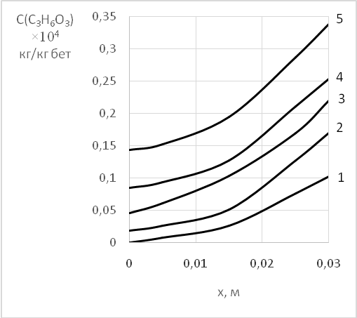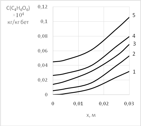 Необходимость мониторинга, последующего прогнозирования и планирования мероприятий по устранению дефектов и профилактики ЖБС обусловлена результатами исследований авторов [26], в которых для определения срока достижения концентрации 0,05 г/л органических кислот, образующихся на поверхности бетона в результате жизнедеятельности черной плесени, у поверхности стальной арматуры в железобетоне построены профили их концентраций по толщине бетонного покрытия (рисунок 3).