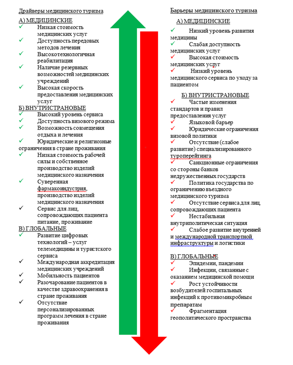 Анализ совокупности современных статистических данных и результатов научных исследований позволяет обозначить основные драйверы и барьеры медицинского туризма (рисунок 1).