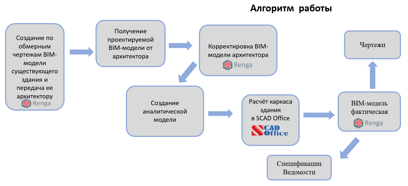 На этапе конструкторских решений модель была скорректирована и экспортирована в SCAD++ для расчёта каркаса. Полученная расчётная модель подтвердила несущую способность конструкций после реконструкции.