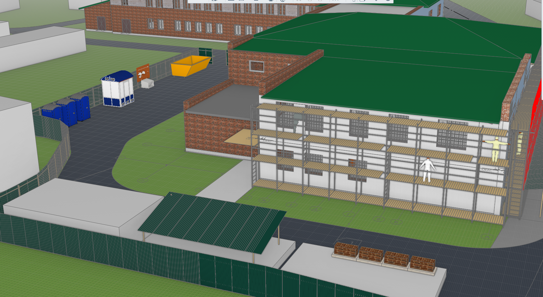После выгрузки ведомости объёмов работ из 3D-модели была составлена таблица трудоёмкости, спецификация строительных материалов, сметная документация, составлены технико-экономические показатели, разработан календарный план выполнения работы и стройгенплан. Модель организации стройплощадки представлена на рис. 8.