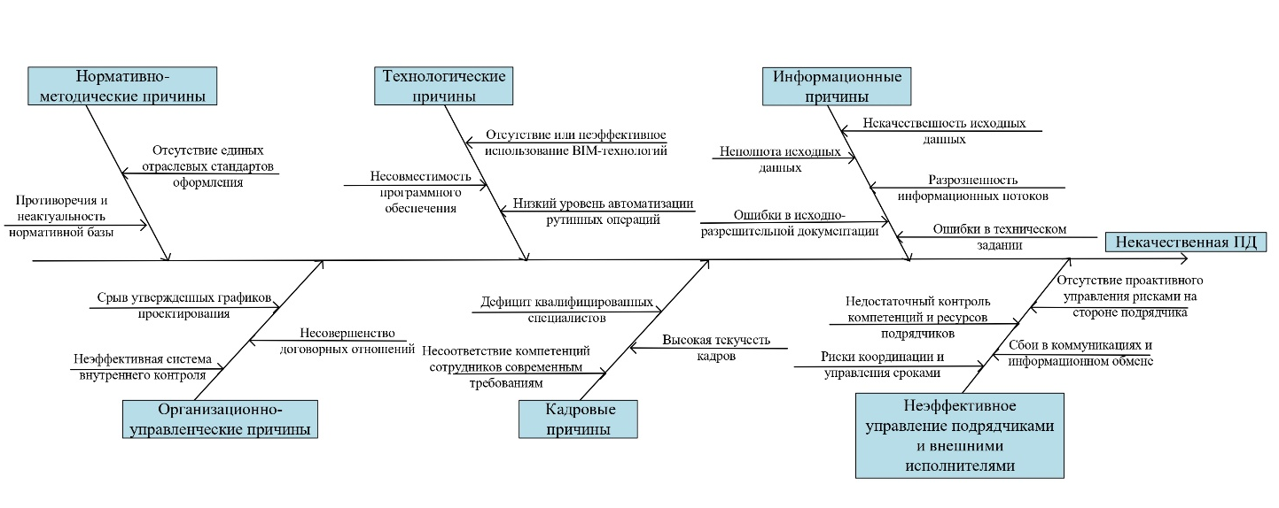 Особое внимание было уделено разработке и применению метода причинно-следственного анализа с построением диаграммы Исикавы. Данный метод позволил систематизировать и визуализировать комплекс факторов, влияющих на качество проектной документации, сгруппировав их по шести основным категориям причин: нормативно-методические, организационно-управленческие, кадровые, информационные, неэффективное управление подрядчиками и внешними исполнителями. Построение диаграммы осуществлялось в соответствии с методическими рекомендациями, изложенными в работе В.Ю. Огвоздина [5]. В качестве центральной проблемы была определена «Снижение качества проектной документации».  Построение диаграммы (рис.1) позволило визуализировать комплексную взаимосвязь между различными источниками рисков и выявить их системный характер [6].