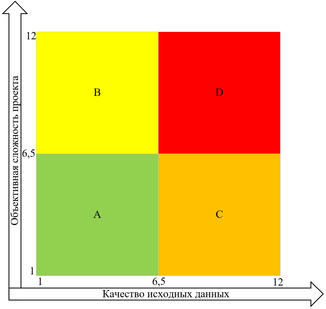 Разработанный комплекс мероприятий по управлению данным риском является вариативным и напрямую зависит от уровня сложности проекта, определяемого по матрице, представленной на Рисунке 2. Для каждого из четырёх уровней (A – D) сформирован соответствующий набор превентивных и корректирующих действий, обеспечивающих целевое воздействие на ключевые причины возникновения риска.