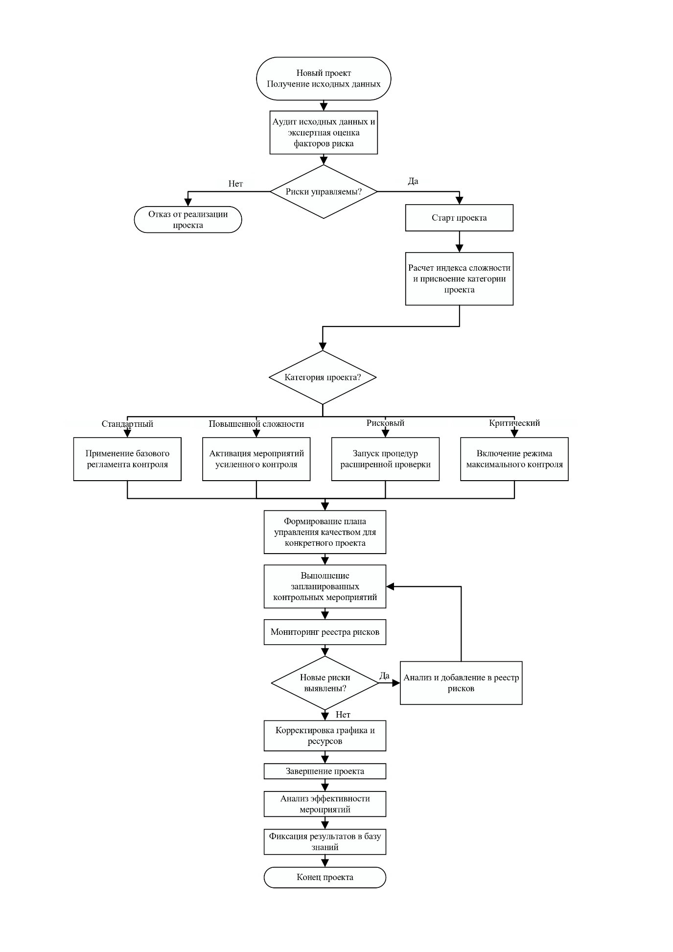 Особого внимания заслуживает разработанная матрица категоризации проектов по уровням сложности. Ее практическая ценность заключается в возможности дифференцированного подхода к управлению рисками в зависимости от характеристик конкретного проекта. Такой подход позволяет оптимизировать ресурсы, направляемые на обеспечение качества, избегая как избыточного контроля для простых проектов, так и недостаточного внимания к сложным объектам.