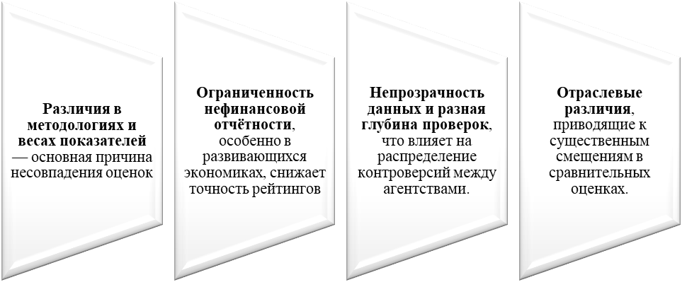 Подобная несогласованность ставит под сомнение сопоставимость рейтингов и представляет реальный методологический вызов для инвесторов, особенно для тех, кто делает ESG-оценки основой для инвестиционных решений.