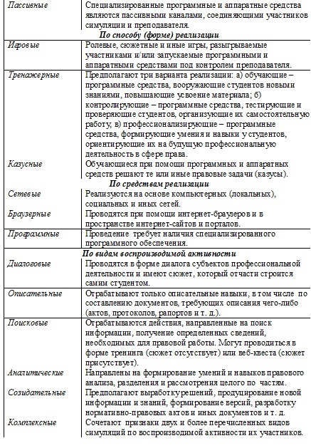 Для уяснения сущности компьютерных симуляций необходима их комплексная классификация, учитывающая специфику подготовки бакалавров юриспруденции. Проанализировав большое количество научных и методических работ, представляем классификацию юридических компьютерных симуляций с выделением их разновидностей (табл. 1).