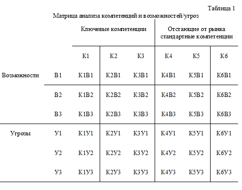 Безусловно, далеко не все сочетания, получаемые в итоговой матрице (табл. 2), окажутся полезны при формировании стратегии организации. Однако подобные комбинаторные методы позволяют генерировать новые, часто прорывные знания, порождающие при должном уровне развития серьезные конкурентные преимущества. Использование ключевых компетенций в области наибольших возможностей может порождать перспективные направления развития организации и становиться основой диверсификации бизнеса.