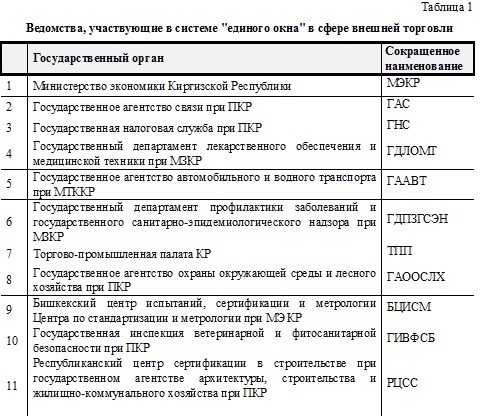 Государственное предприятие «Единое Окно» в сфере внешней торговли (далее – НЕО) при Министерстве экономики Киргизской Республики разработало и внедрило информационную систему «единого окна» при финансовой поддержке АБР. Система единого окна установлена в центральном офисе ЕО. Система имеет веб-интерфейс с доступом для государственных органов, брокеров и трейдеров. Система официально функционирует c 2012 г. Она установлена в помещении государственного предприятия и доступна 24 часа в сутки. Для получения доступа и для работы в системе пользователи должны использовать цифровую подпись. В настоящее время персонал ЕО предоставляет техническую поддержку для государственных учреждений, брокеров и трейдеров. Несмотря на то, что система в настоящее время официально функционирует, некоторые государственные учреждения, органы не используют ее активно. Причины такого не активного использования механизмов «единого окна» участниками внешнеэкономической деятельности следующие: