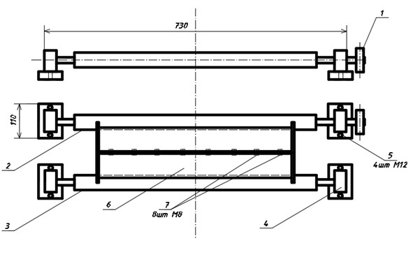 1 – шкив привода центрифуги; 2 – ведущий опорный каток; 3 – ведомый опорный каток; 4 – упор вала опорной муфты с шарикоподшипником; 5 – крепеж упора к станине (болт М12); 6 – форма; 7 – соединение половинок формы (болт М8).