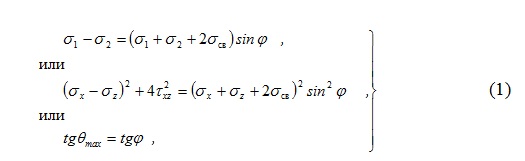 Для отыскания положения, формы и размеров ОПСГ традиционно используют условие прочности Кулона [1], которое можно представить в следующих транскрипциях