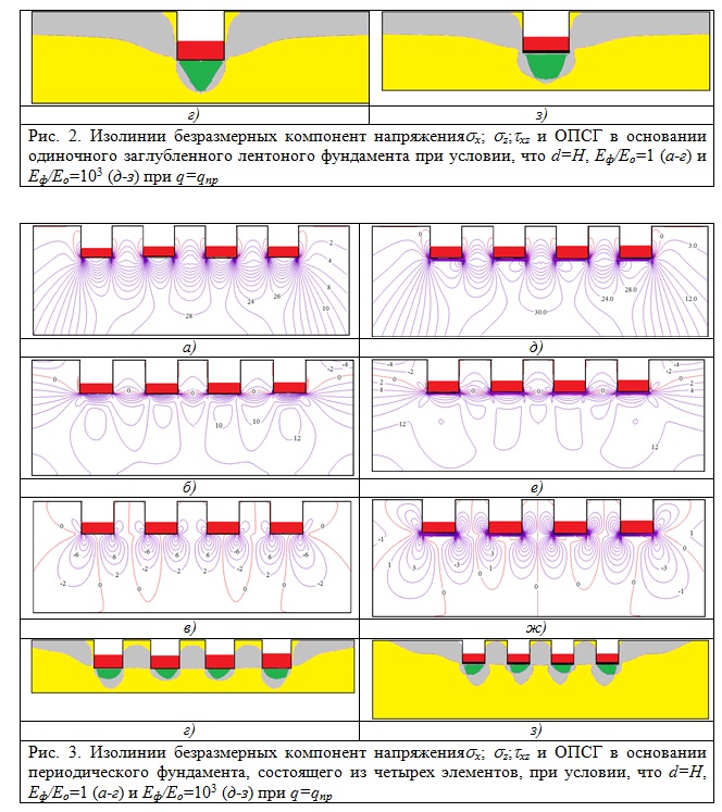 На рис. 2 и 3 в качестве примера изображены картины изолиний компонент напряжения, ОПСГ и УГЯ в основании нежесткого (слева) и жесткого (Eф/Eо=103, справа) одиночного и периодического (четыре элемента) ленточного фундамента, соответствующие предельным значениям безразмерной (в долях γН) величины интенсивности равномерно распределенной нагрузки qпр, воспринимаемой фундаментом. Анализ этих рисунков и результатов вычислений показывает, что величины предельных нагрузок для нежесткого и жесткого фундамента существенно отличаются по величине при всех прочих равных условиях из-за различного характера распределения напряжений в основании этих фундаментов, зависящего от их жесткости.