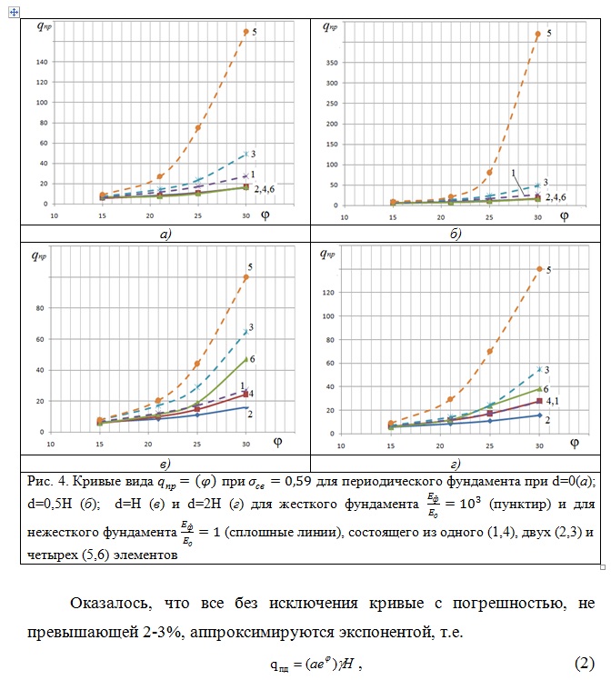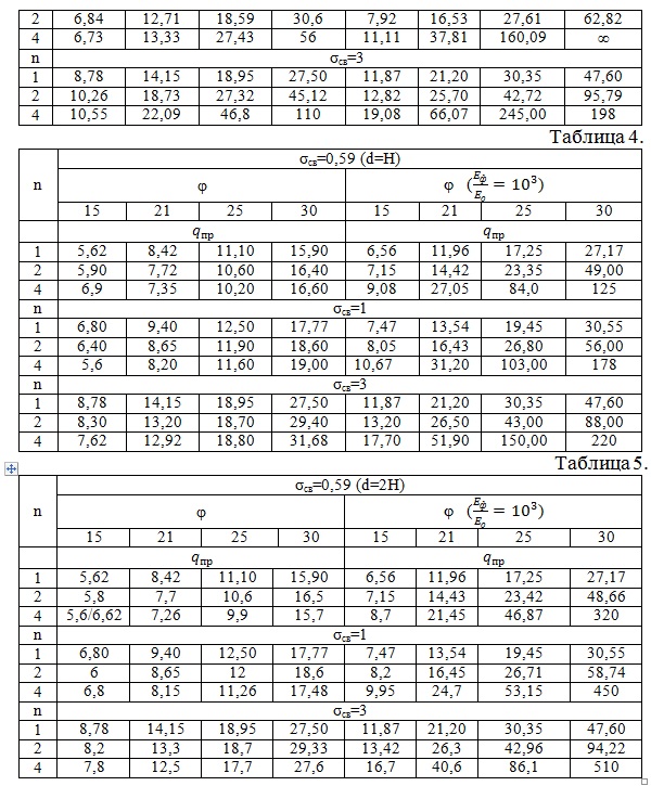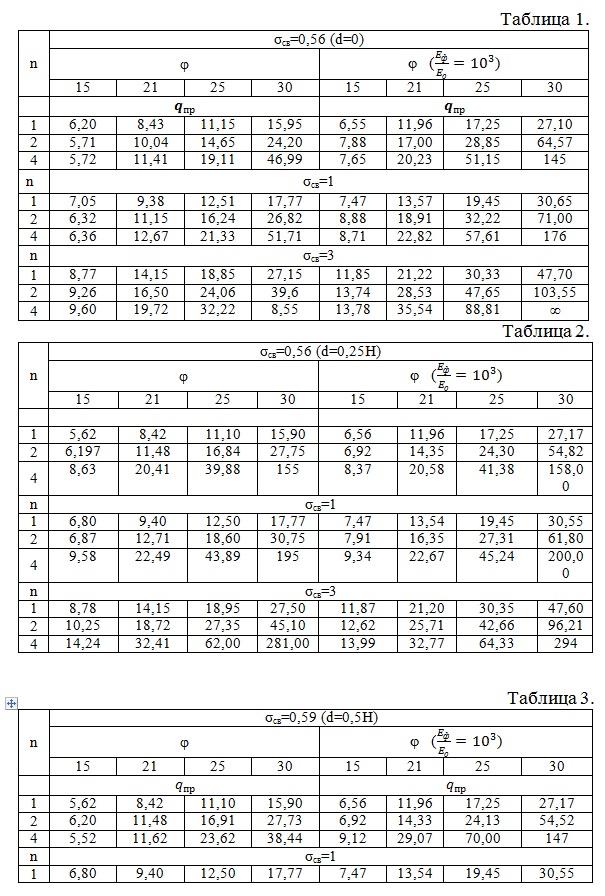 - величина интенсивности предельно допустимой нагрузки на однородное основание заглубленного ленточного «периодического» фундамента (qпд) при всех прочих равных условиях наиболее чувствительна (по мере убывания) к углу внутреннего трения грунта основания j, числу n, жесткости фундамента (Еш/Ео), приведенному давлению связности sсв. Так, увеличение угла внутреннего трения грунта j от 15о до 30о вызывает рост qпд при n=1 в 3,16 раза, при n=2 – в 4, 11 раза, а при n=4 – в 4,14 раза; изменение величины sсв от 0,59 до 6 обуславливает увеличение qпд для тех же значений n в 2,52; 2,6 и 2,63 раза соответственно. Такое же изменение расчетных параметров для основания жесткого периодического фундамента (Еш/Ео=103) влечет за собой рост интенсивности предельно допустимых нагрузок в 3,68; 5,67; 7,09 и в 2,74; 2,85; 3,03 раза соответственно. При расстоянии между фундаментными лентами равном приблизительно половине глубины заложения фундамента величина предельно допустимой нагрузки на основание является максимальной. Изменение величины Еш/Ео от 1 до 103 при всех прочих равных условиях может повысить несущую способность основания более чем на 200%.
