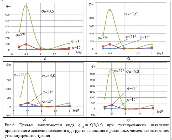 Проведя дополнительные исследования, вопроса о том, как влияет при всех прочих равных условиях расстояние между элементами периодического фундамента на несущую способность основания, построили графические зависимости вида Qpd=f (b\H) при фиксированных значениях угла внутреннего трения φ грунта основания и различных численных значениях приведенного давления связности Q и наоборот. Эти кривые представлены на рис. 5 и 6. Из этих рисунков видно, что при расстоянии межу фундаментами равным примерно половине их глубины заложения, величина предельно допустимой нагрузки на основание «периодического» фундамента становится максимальной. Отметим, что такая закономерность прослеживалась при условии, что ширина элемента фундамента принимала различные значения.