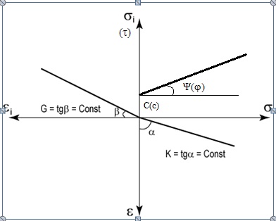– первые инварианты тензоров напряжений и деформаций, соответственно (объемная деформация); i, i – вторые инварианты девиаторных частей тензоров напряжений и деформаций, соответственно (деформация формоизменения-сдвига); K= – модуль объемной деформации; G = – модуль сдвига.