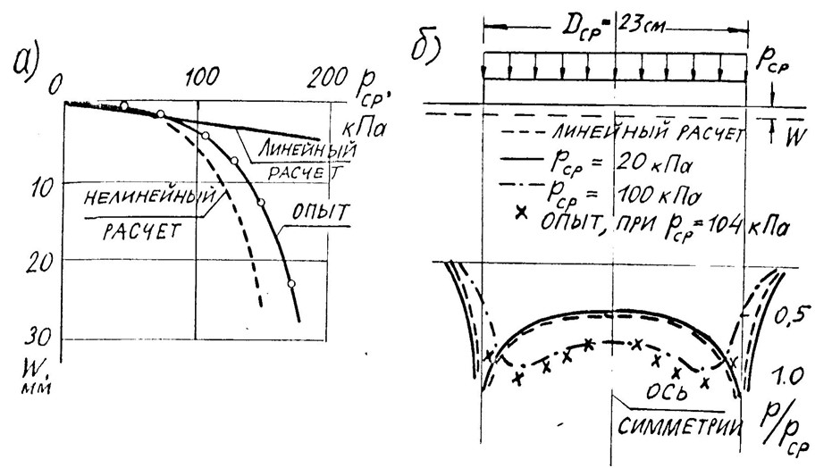 Рис.4. Результаты линейного и нелинейного расчетов [1]: а) графики осадки круглого жесткого фундамента и штампа; б) эпюры контактных напряжений под круглым жестким фундаментом и штампом