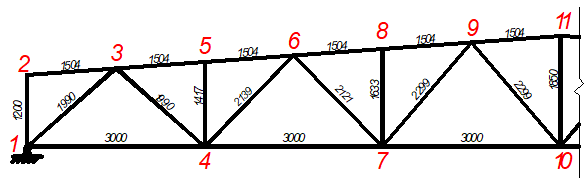 В заданной ферме 13 узлов верхнего пояса. Для удобства расчета нагрузки прикладываются в узлах верхнего пояса. При этом в качестве кровельного материала был принят металлический профнастил. Так как профнастил является легким конструктивным материалом, то в расчете его масса не учитывается.
