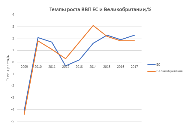 Рисунок 1. – Темпы роста ВВП ЕС и Великобритании, 2009-2017 гг. (%)