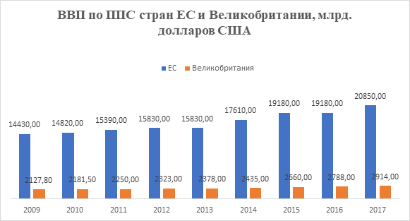 Рисунок 2. – ВВП по ППС стран ЕС и Великобритании в 2009-2017 гг., млрд. долларов США