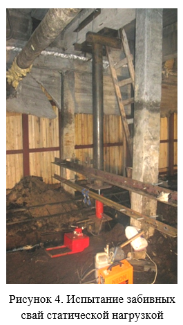 2. Забивные сваи. Успешным оказался опыт погружения свай с помощью пневмомолота. Применялись трубчатые стальные сваи диаметром 220 мм, собираемые из отдельных секций длиной 1,5…2 м (рисунки 2, 3). Применялся молот марки СО-166 массой 400 кг. На устройство одной сваи, включая заполнение трубы бетонной смесью, затрачивалось около 2 часов. Для проведения испытаний таких свай статической нагрузкой потребовалось конструирование специальных приспособлений для передачи нагрузки от домкрата на ригели цокольного перекрытия или ростверки существующего фундамента (рисунок 4). Согласно техническому заданию проектной организации максимальная нагрузка на сваи при испытаниях составляла 300 кН.