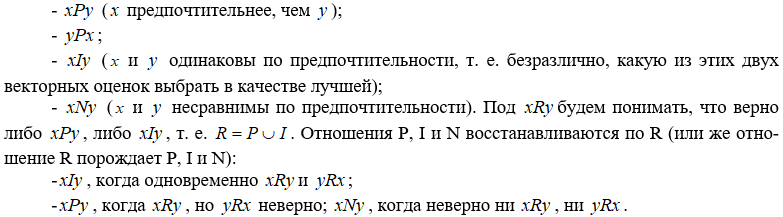 При решении задачи на основании полученной информации во множестве векторных оценок Х строятся бинарные отношения предпочтения и безразличия, которые затем наряду с дополнительными гипотезами и принципами (например, принципом наибольшего гарантированного результата, применяемым при наличии неопределённых факторов) используются для построения отношения предпочтения во множестве стратегий U и выделения оптимальной стратегии [2,3]. В дальнейшем отношения строгого предпочтения, безразличия, нестрогого предпочтения и несравнимости будут обозначаться соответственно буквами P, I, R и N, которые при необходимости будут снабжаться теми или иными индексами (верхними или нижними).