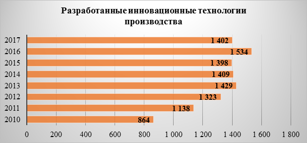 По приведенным выше данным бесспорен совокупный прирост разработанных инновационных технологий производства с 864 единиц в 2010 году до 1 402 единиц в 2017 году, однако, данное значение является меньшим в сравнении с показателем предшествующего 2016 года (1 534 единиц). В целом отмечается положительная динамика, а значит, и прирост активности с точки зрения инноваций.