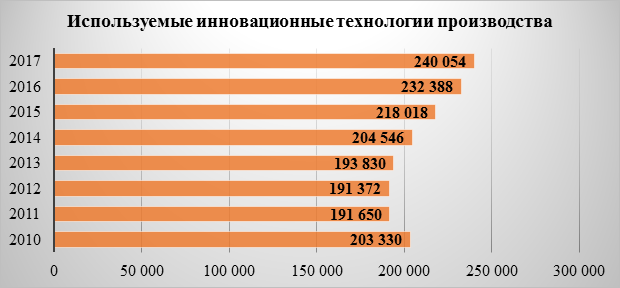 По приведенным выше статистическим сведениям, можно говорить о том, что за избранный временной интервал в совокупности произошел однозначный масштабный прирост использования инновационных технологий производства с 203330 единиц в 2010 году до 240054 единиц в 2017 году (данное значение является самым высоким за заданный диапазон).