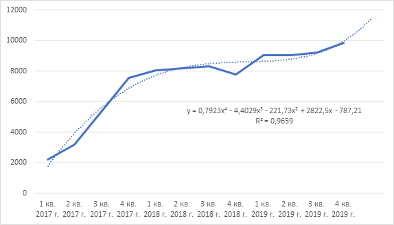 в 2017 – 2019 г.г. Пунктиром обозначена линия тренда и прогноз на 1 квартал вперед.