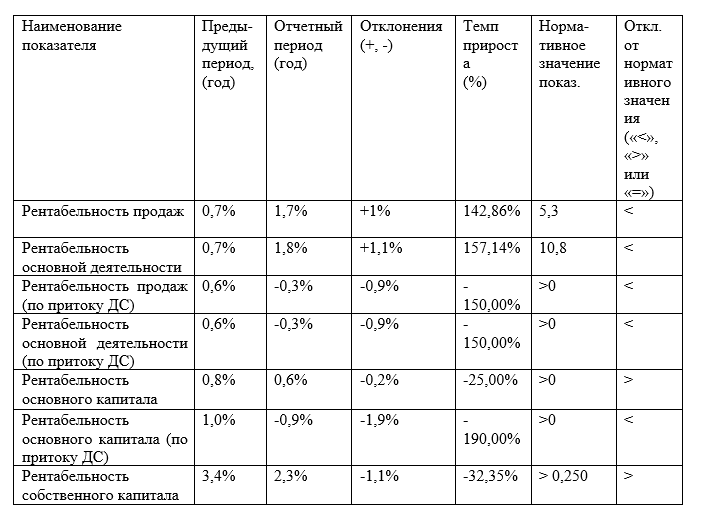 Необходимым и достаточным отражением недостаточной эффективности экономической деятельности предприятия является анализ показателей рентабельности, большинство из которых ниже нормативных значений (результаты расчетов показателей рентабельности и их сравнение с нормативными значениями представлены в таблице 1).