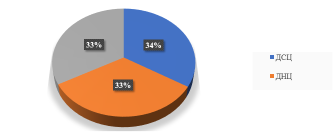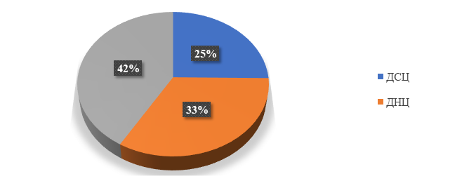 В рамках диспетчерской службы выявлено 33 % действий, не создающих ценность; 42 % - действий, не создающих ценность, но неизбежных в текущих условиях функционирования предприятия; и всего лишь 25 % действий, создающих ценность (рисунок 1, здесь и далее: ДНЦ – действие, не создающее ценность; ДСЦ – действие, создающее ценность).