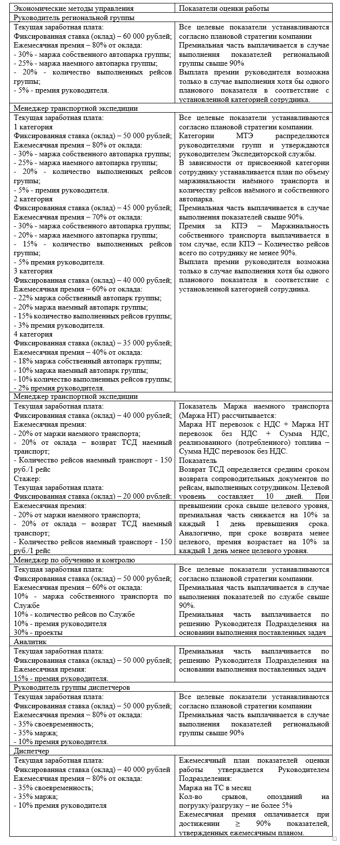 Таблица 2. Целевые показатели и экономические методы управления сотрудниками
