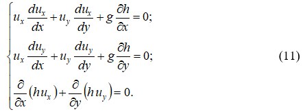 Система дифференциальных уравнений в частных производных (11) описывает течение двухмерных в плане открытых стационарных потоков в горизонтальном водоводе без учёта сил сопротивления потоку.