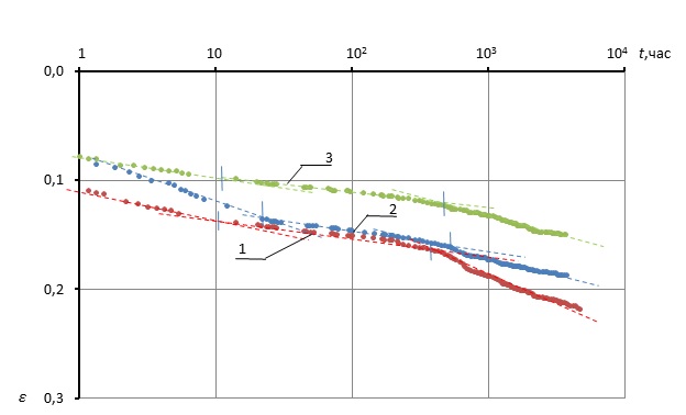 Рис. 1. Развитие деформаций торфа во времени при компрессионных испытаниях: