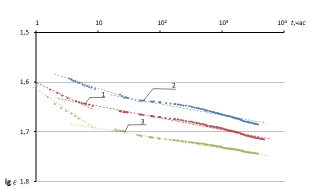 в логарифмических координатах; высота образцов: 1 – 3 см, 2 – 5 см, 3 – 7 см